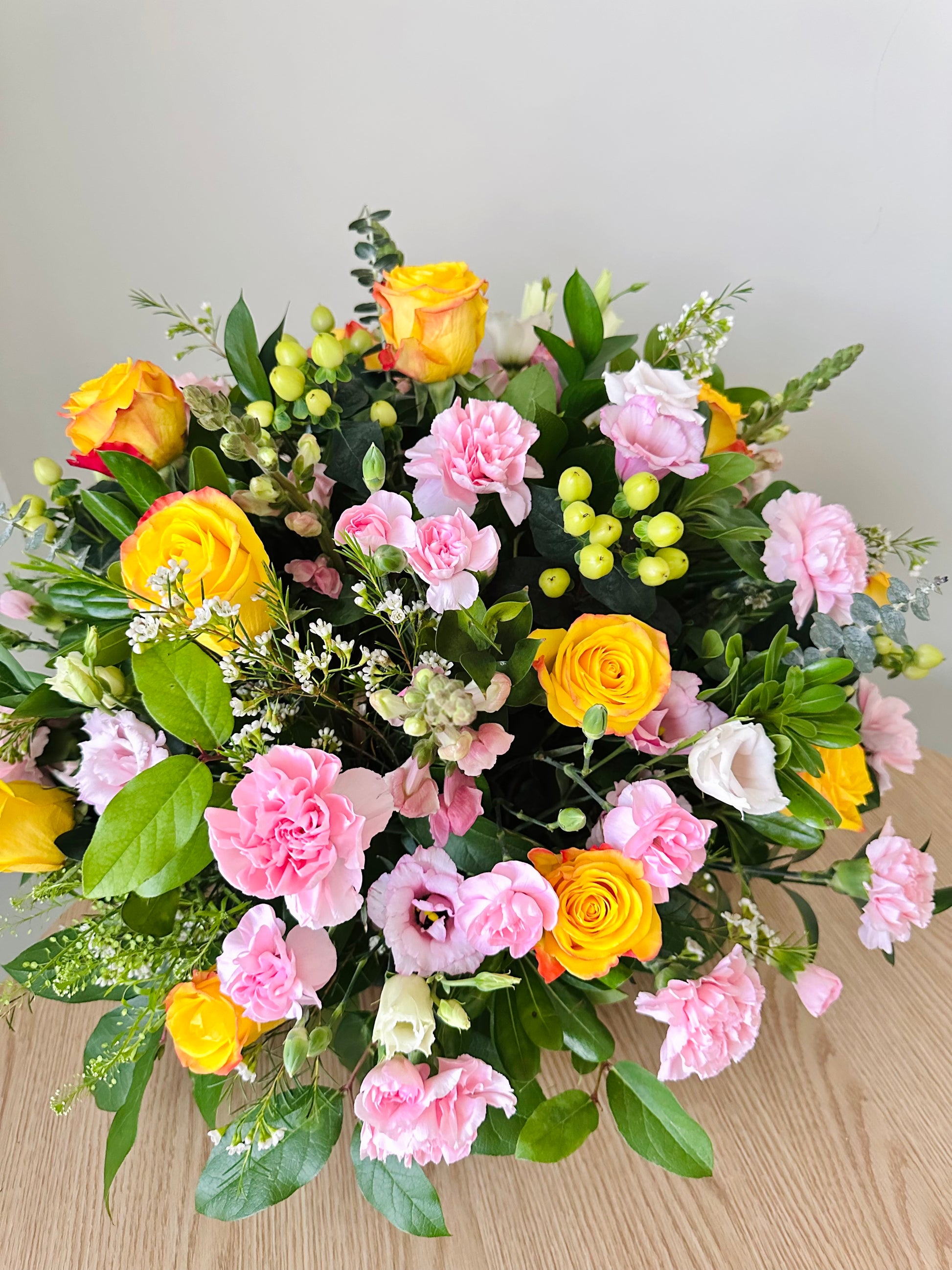 This premium floral design is crafted with a variety of fresh, vibrant flowers including roses and lush greenery, creating a garden-style arrangement full of life and sophistication. Perfect for birthdays, celebrations, congratulations, or simply to brighten someone’s day.