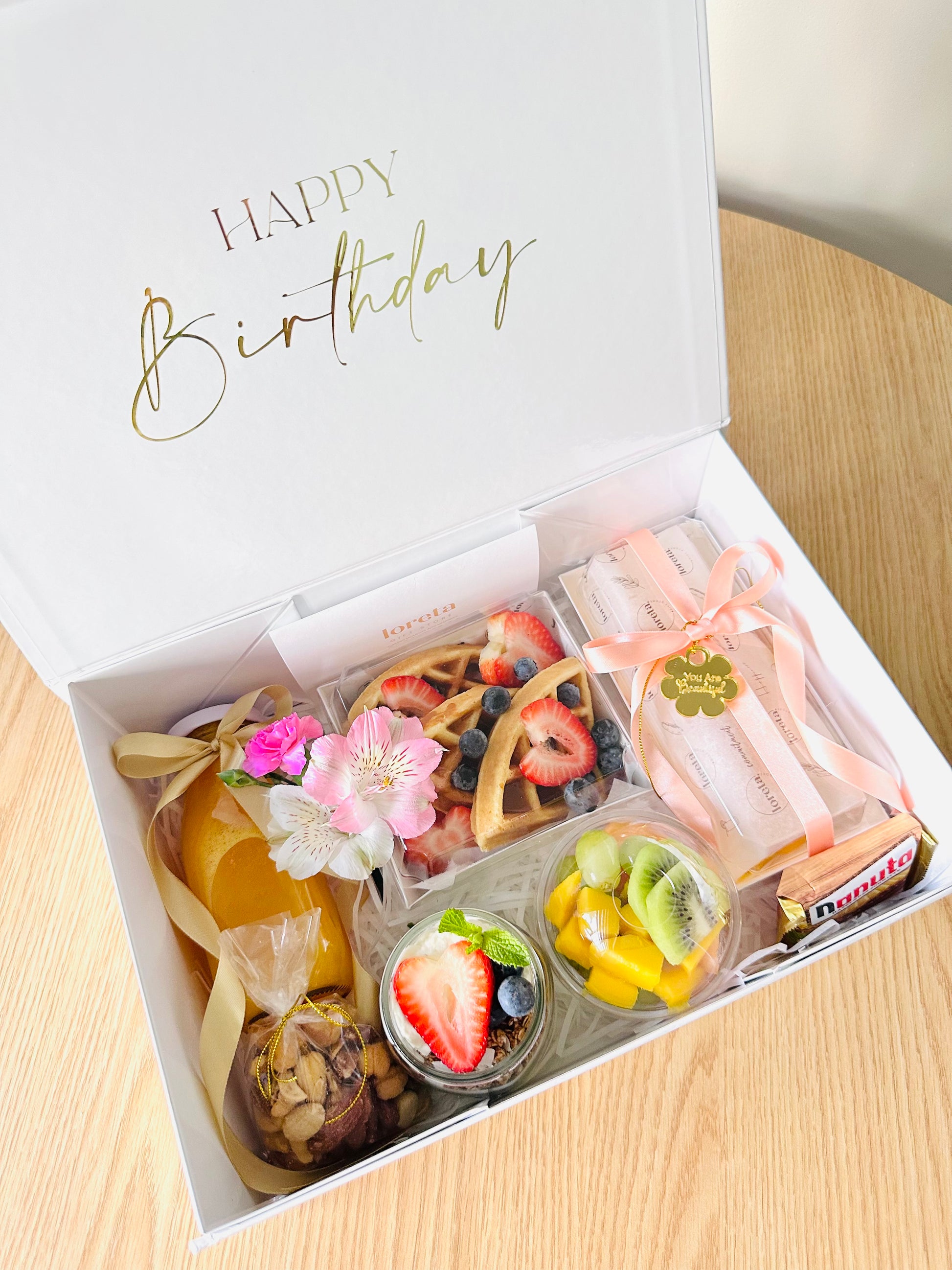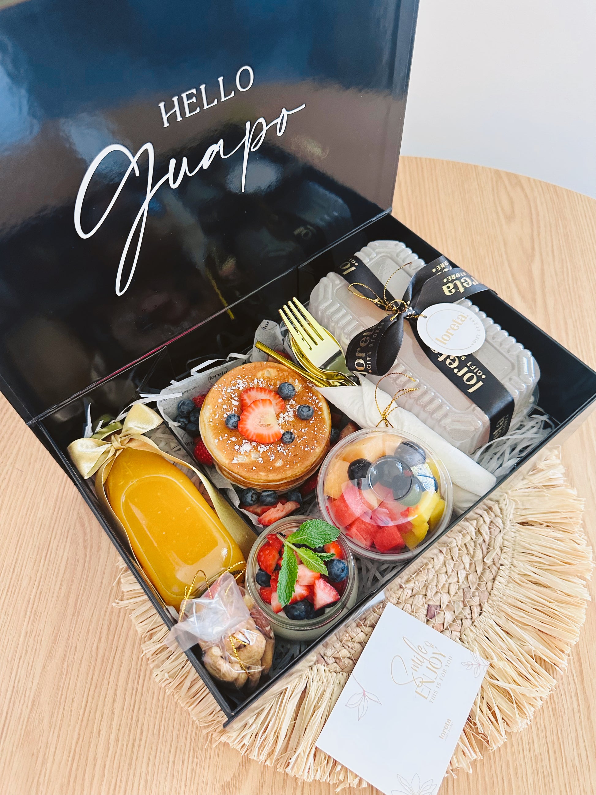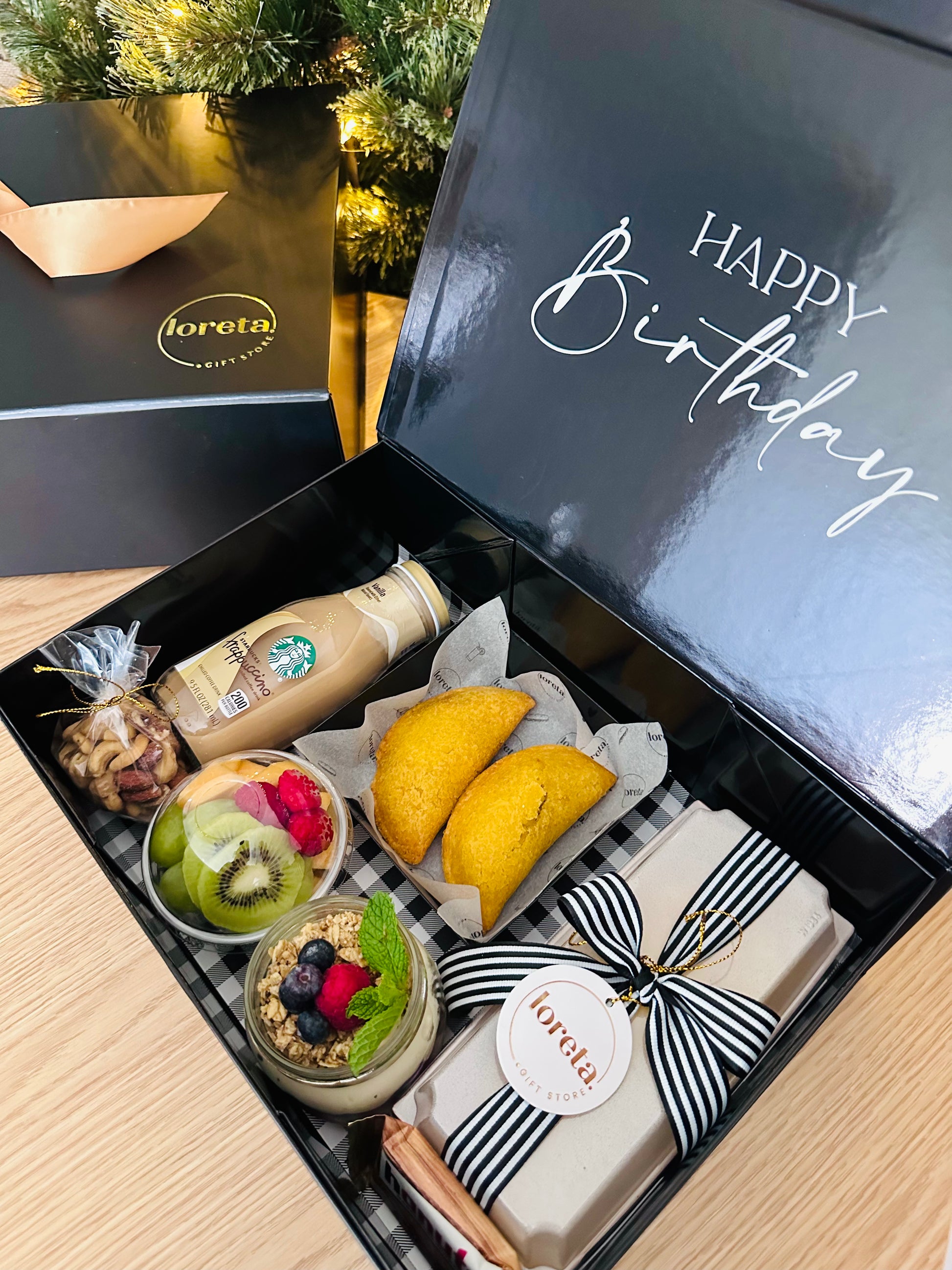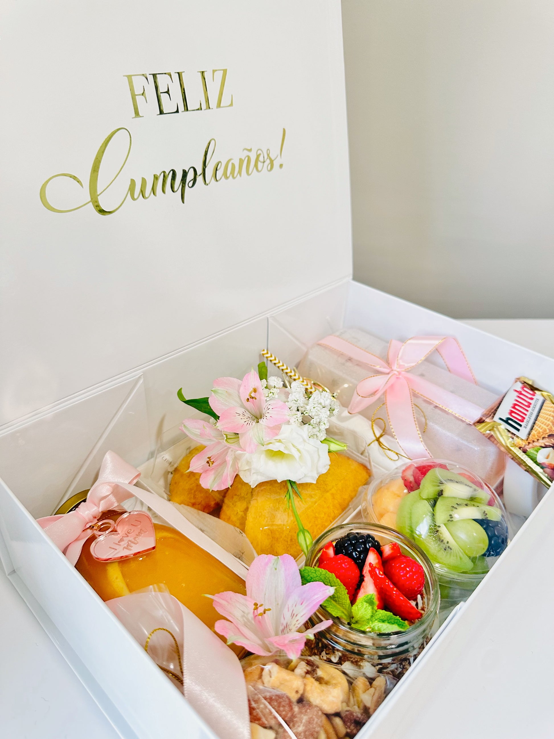 Sorprende a tus seres queridos con nuestra elegante caja de lujo, llena de productos frescos y deliciosos, perfecta para regalar una mañana inolvidable y almacenar recuerdos preciados.