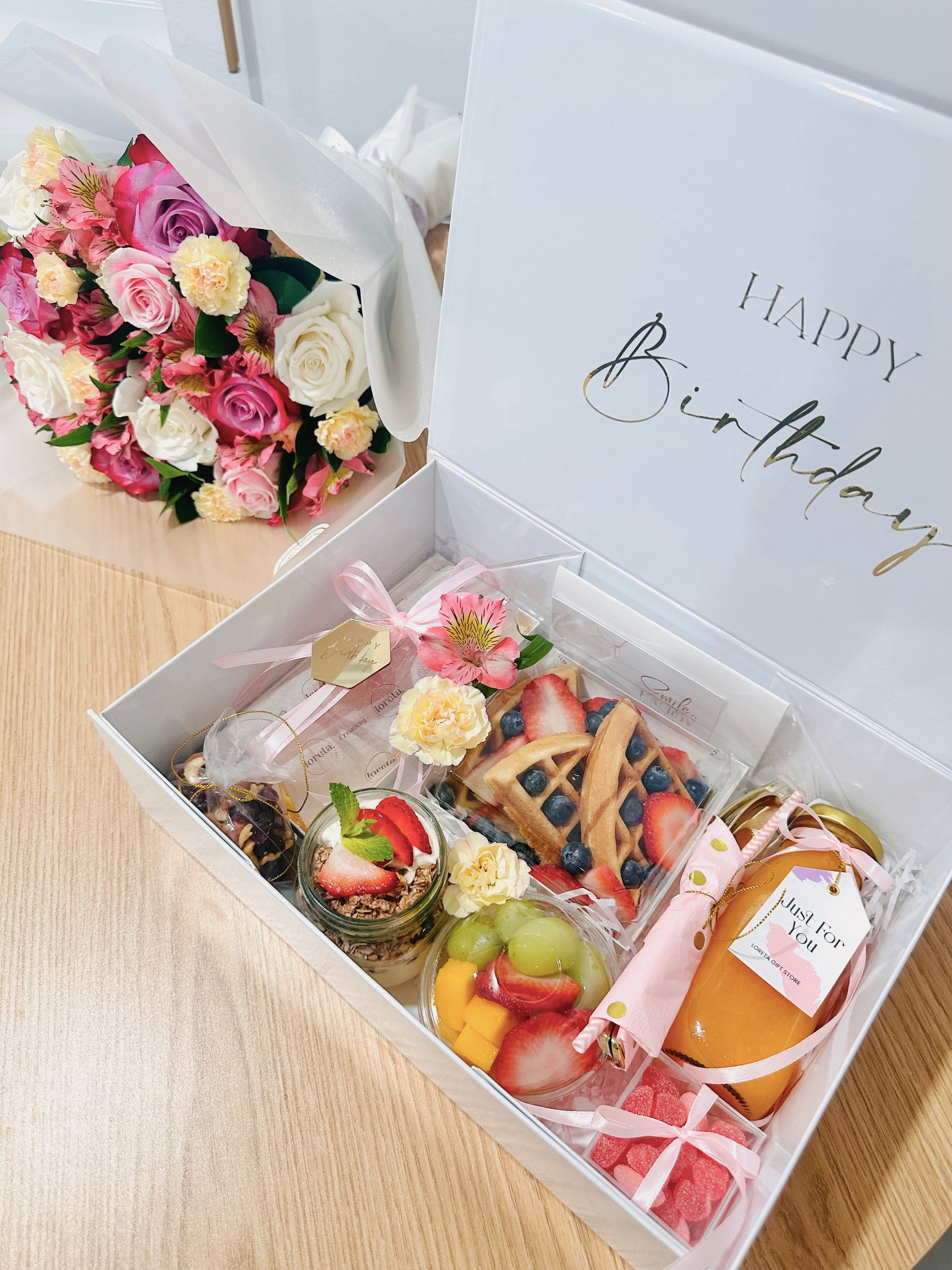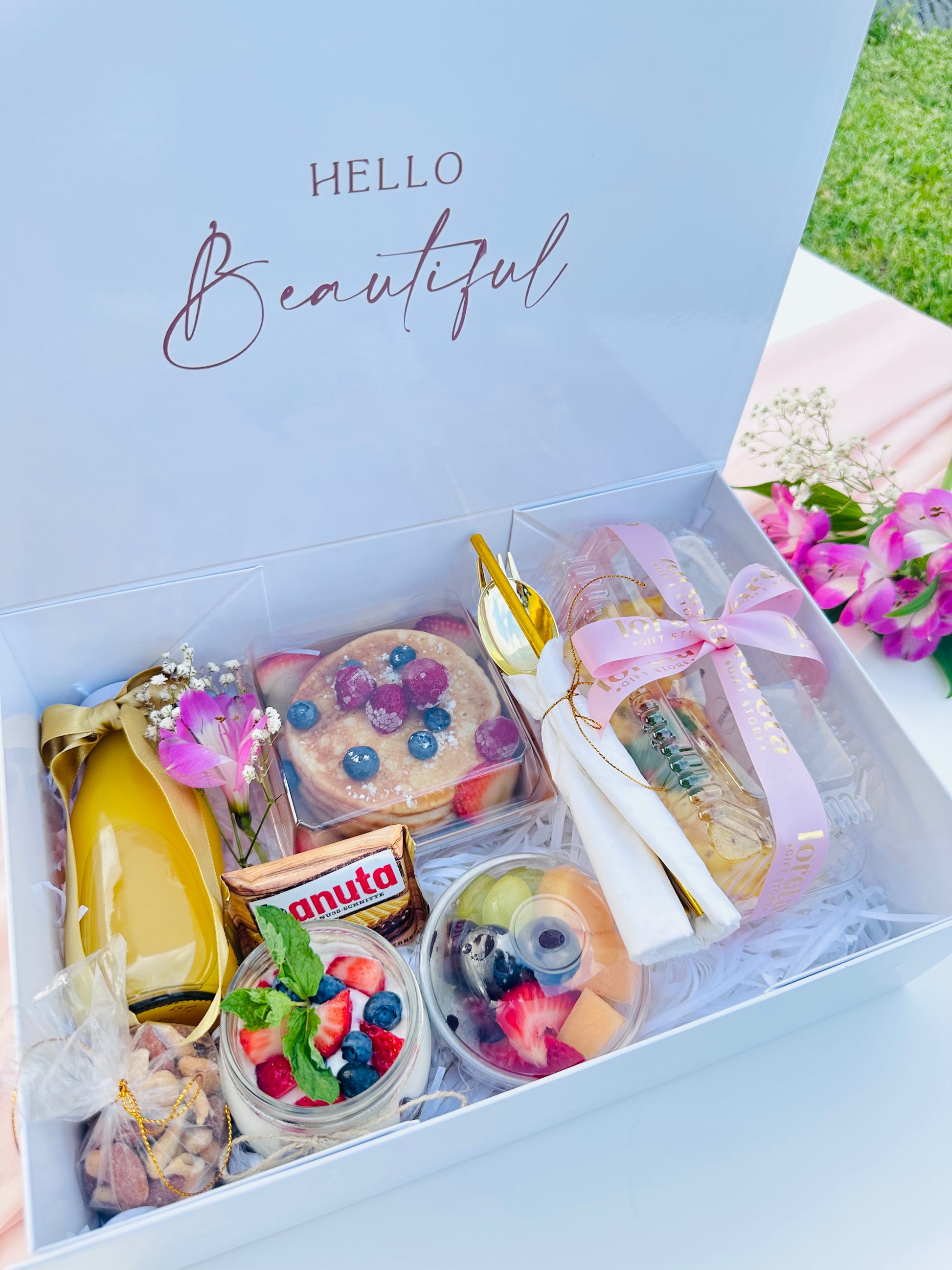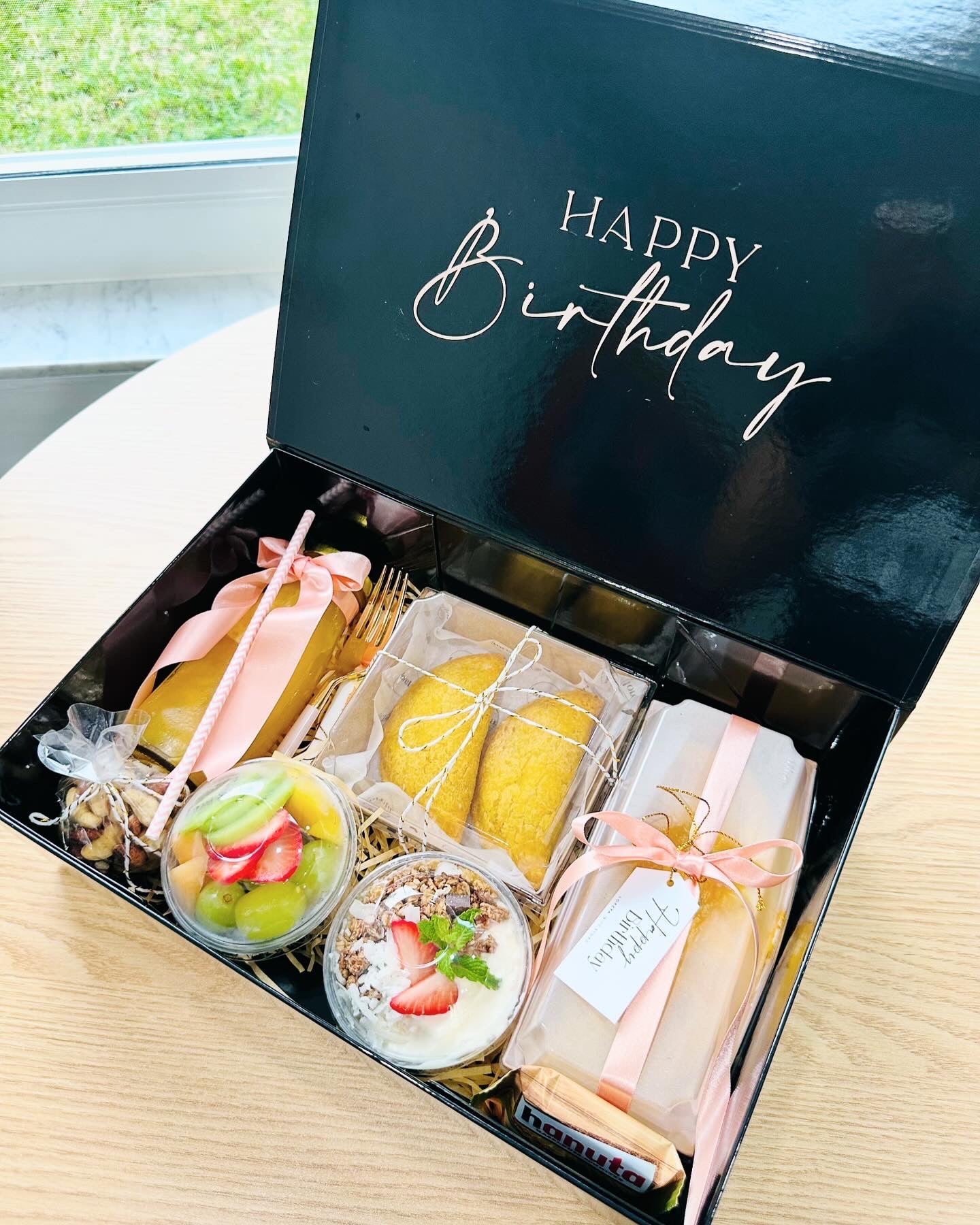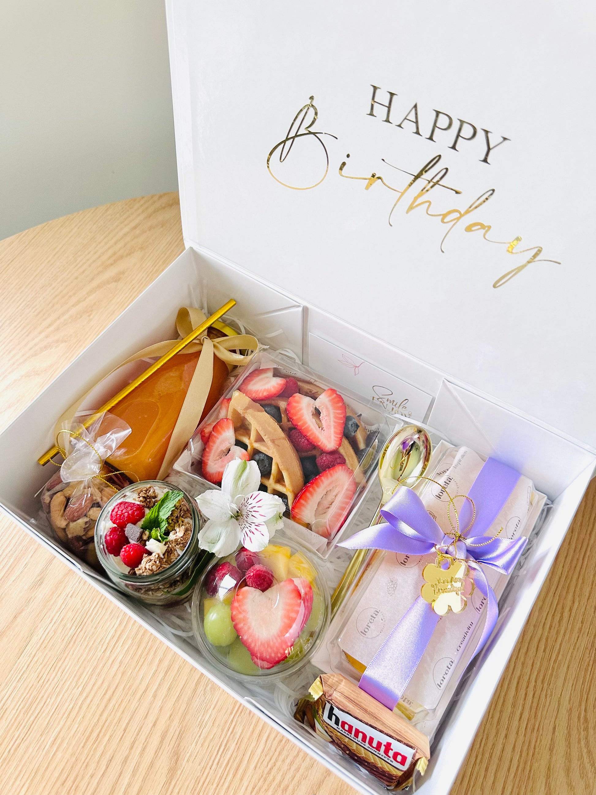 Sorprende a tus seres queridos con nuestra elegante caja de lujo, llena de productos frescos y deliciosos, perfecta para regalar una mañana inolvidable y almacenar recuerdos preciados.