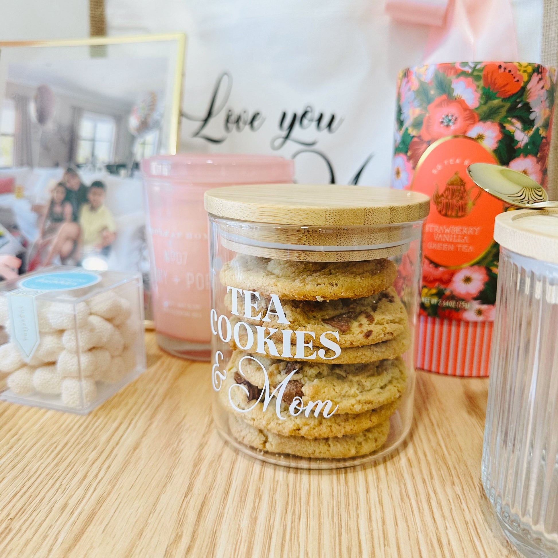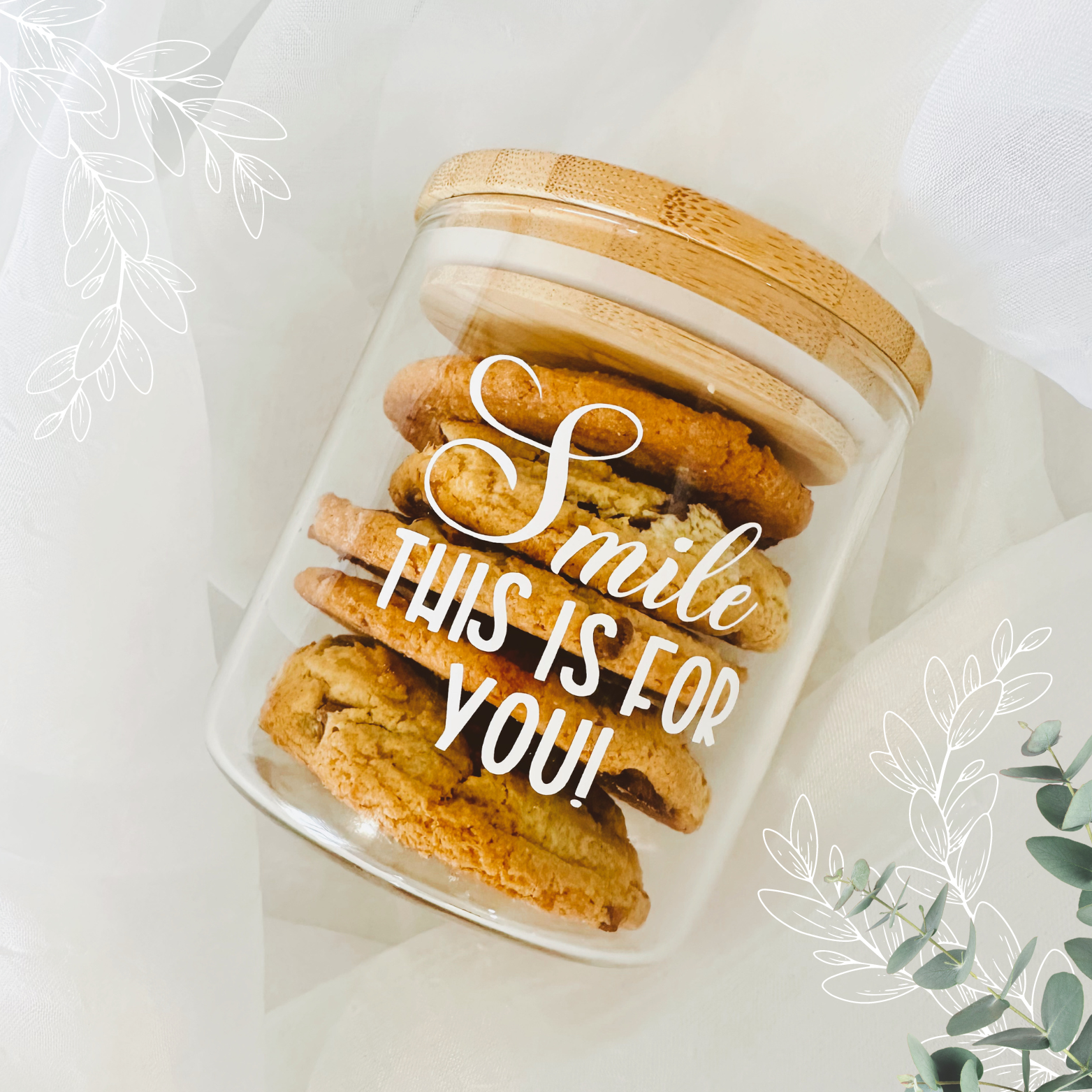 Galletas con chips de chocolate y macadamia en presentación de tarro de vidrio con tapa de bambú y marcado con vinilo.