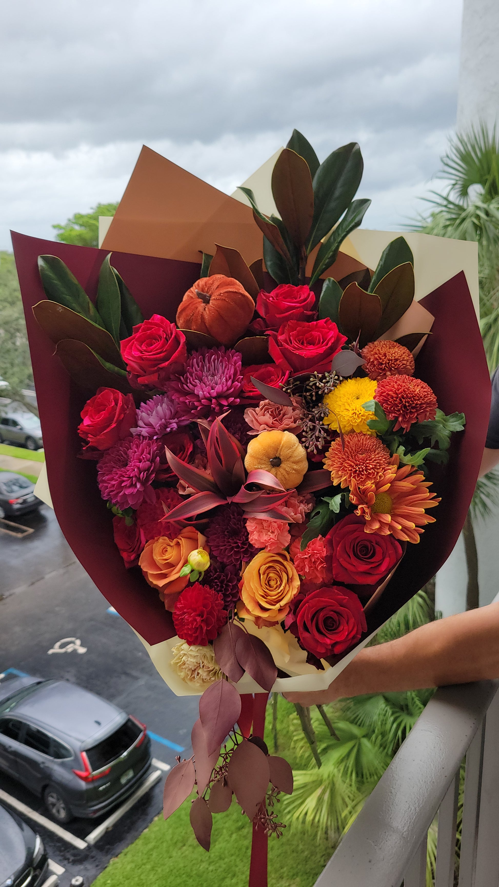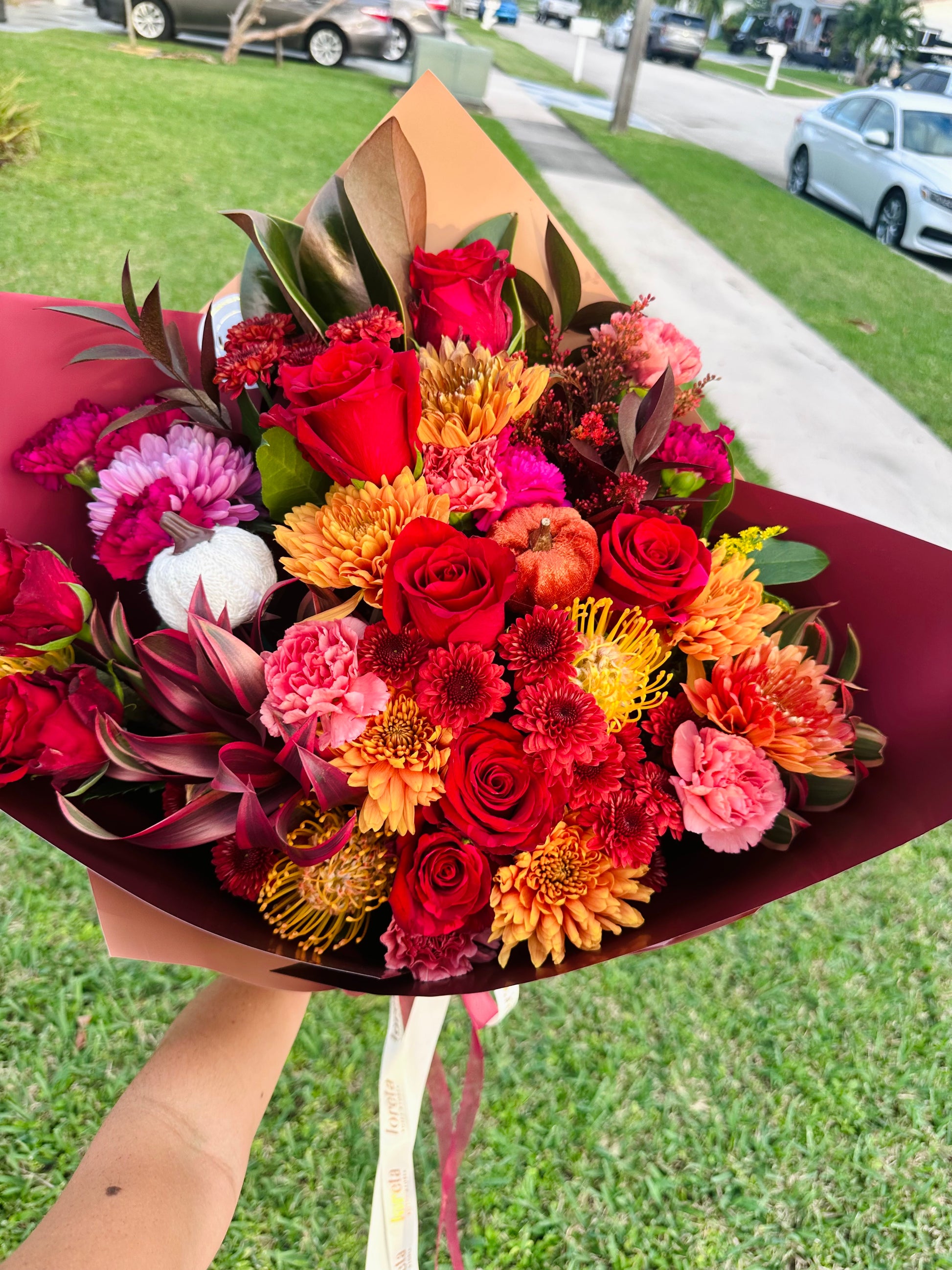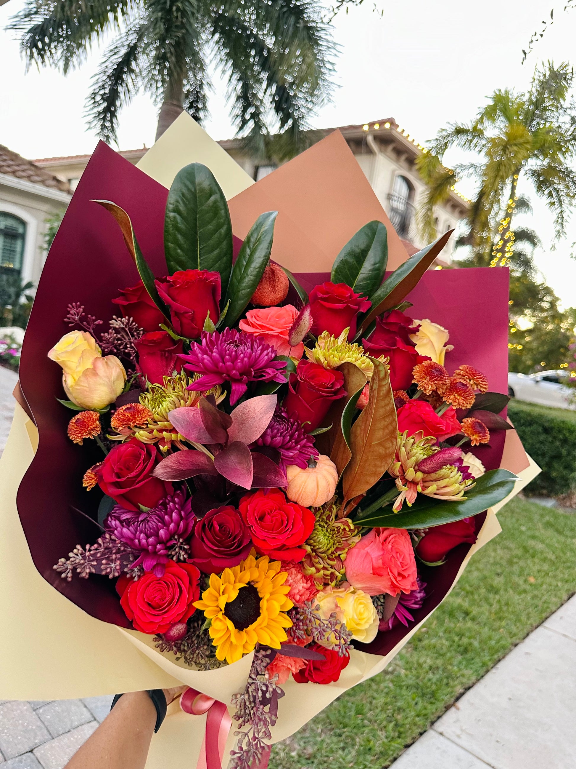 Elevate the season with our luxurious fall mixed flower bouquet, a unique combination that captures the essence of autumn. This elegant arrangement blends warm tones of oranges, golds, deep purples, and burgundy, all accented with hand-painted greenery for an artistic and modern touch. Each premium flower is carefully selected to reflect the latest fall trends, creating a bouquet that stands out not only for its beauty but also for its sophistication. Perfect for gifting or decorating, this arrangement is the epitome of luxury and autumn style. Let your fall bloom with an exclusive and vibrant design!