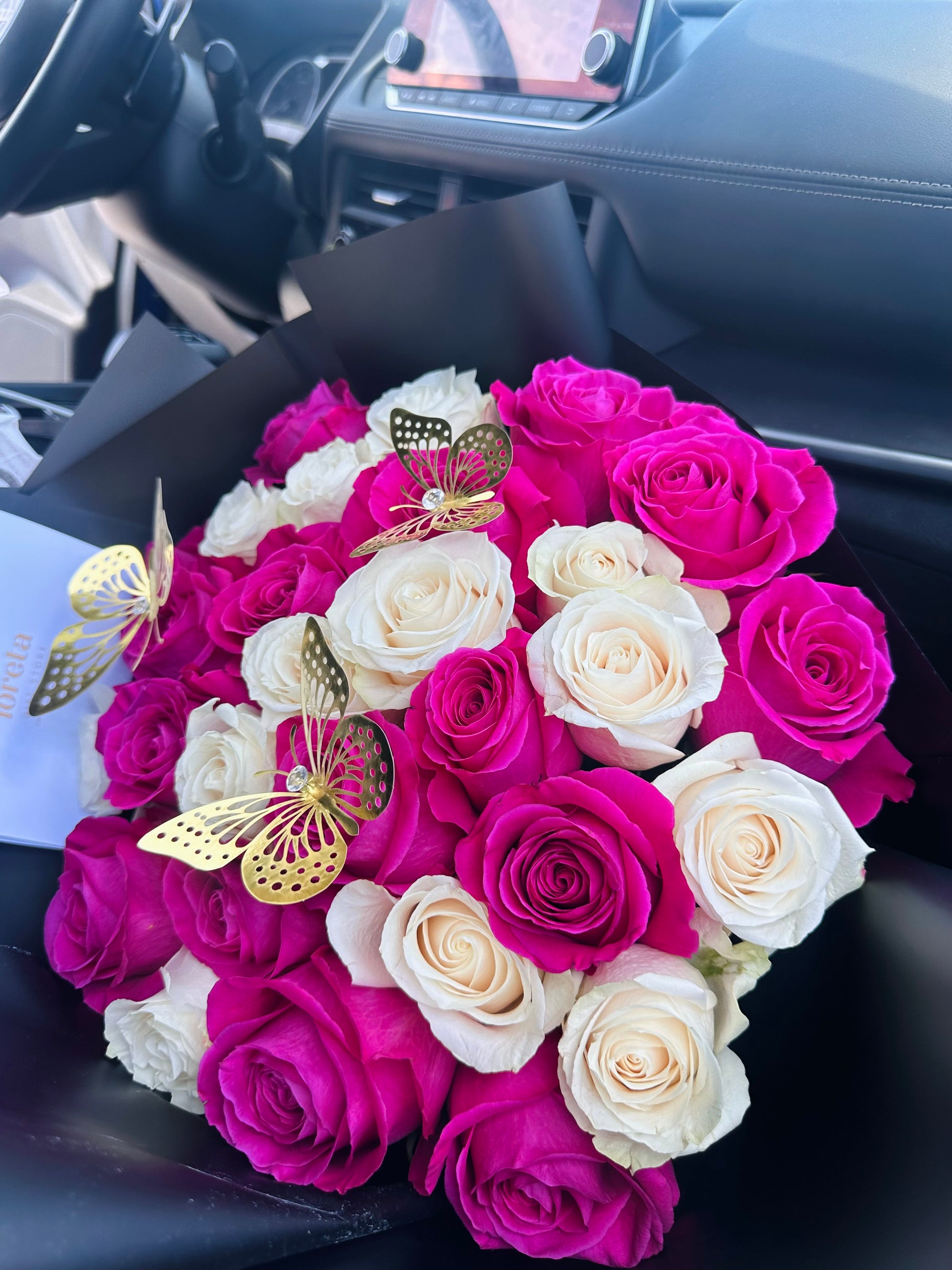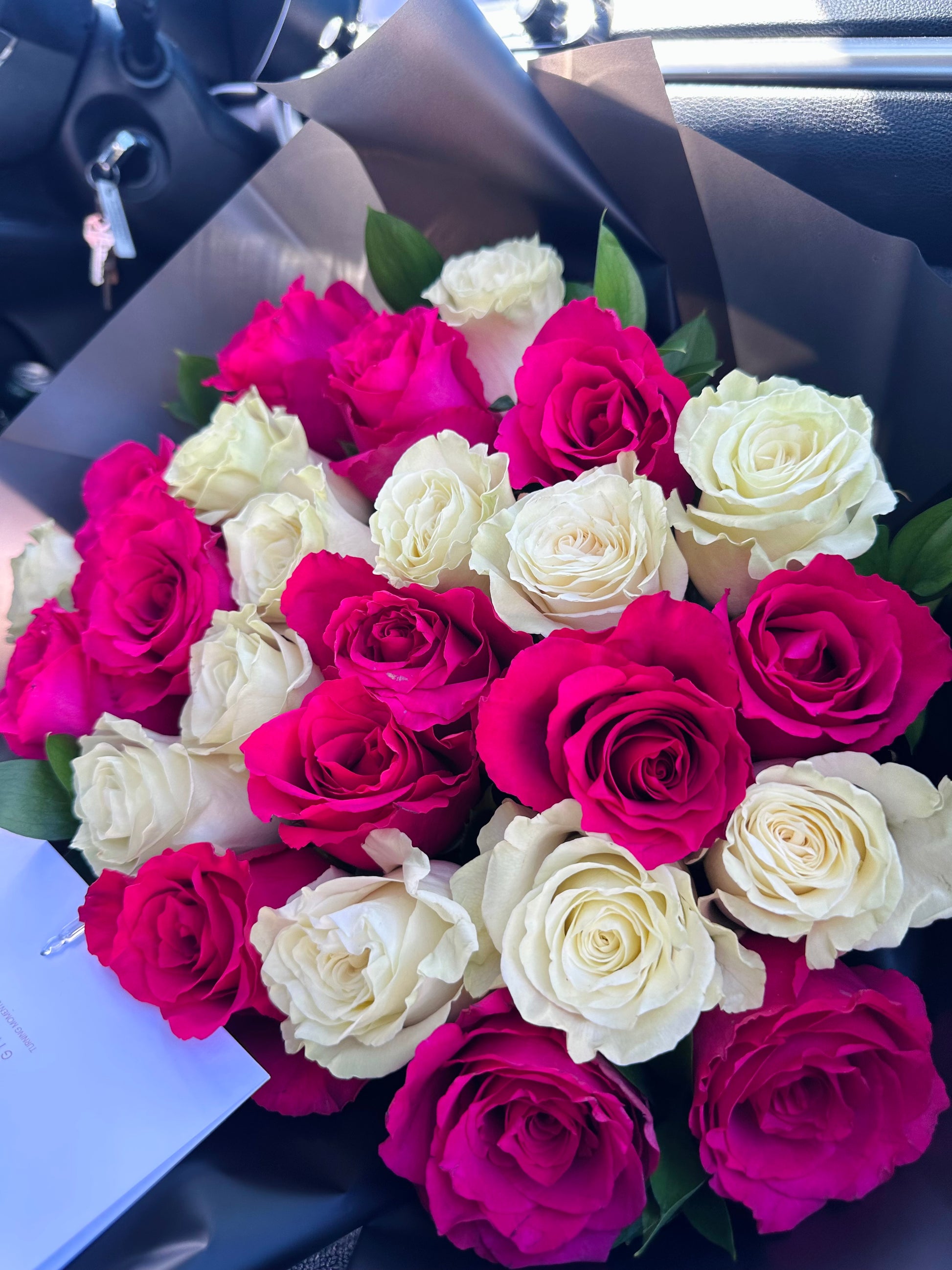 - Fresh long-stem Ecuadorian roses (fuchsia & ivory)