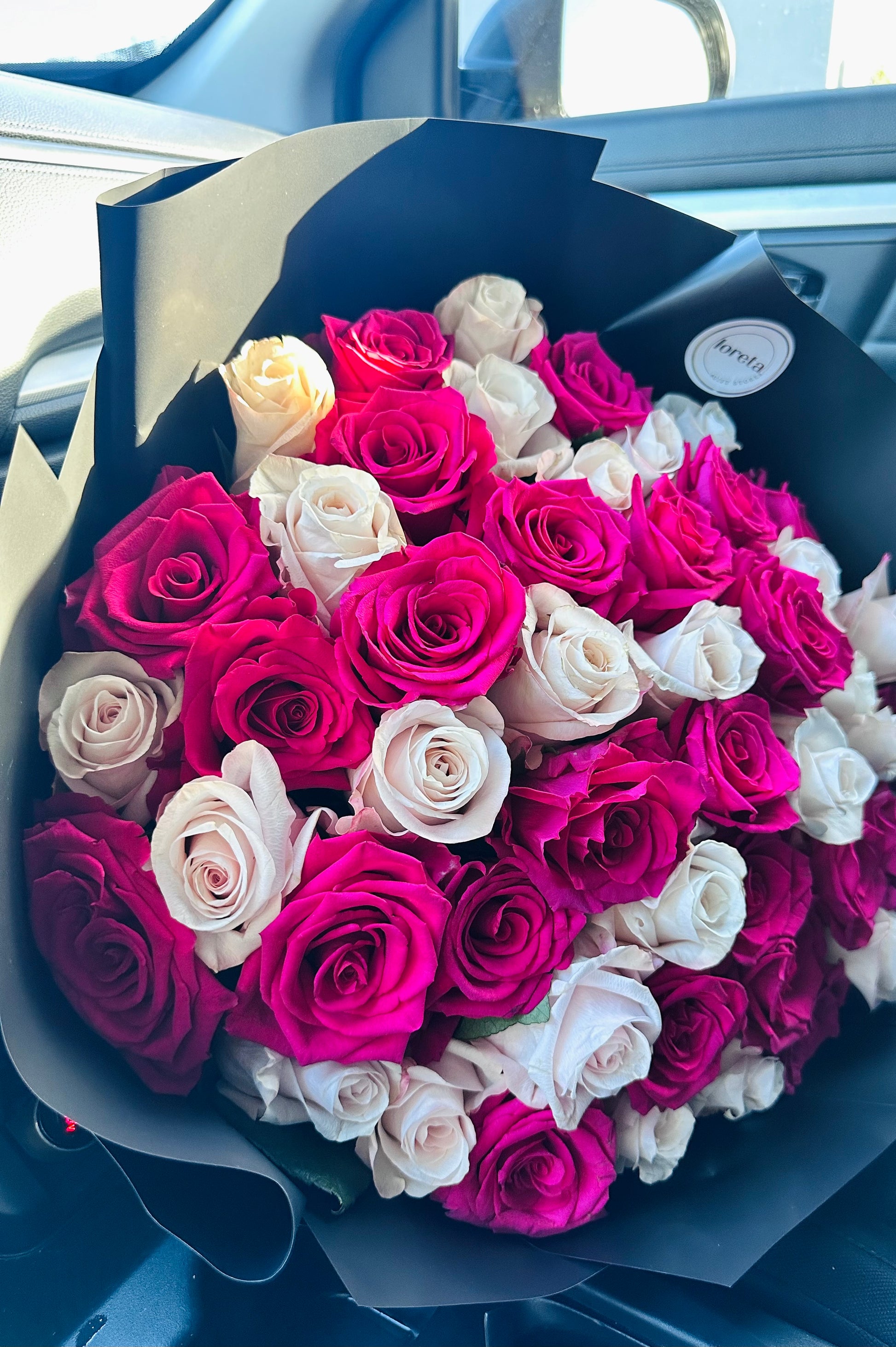 Send fresh flowers today. Premium fuchsia and ivory Ecuadorian roses, handcrafted for Valentine’s with luxury wrapping and message card included. Elegant, modern, and unforgettable.