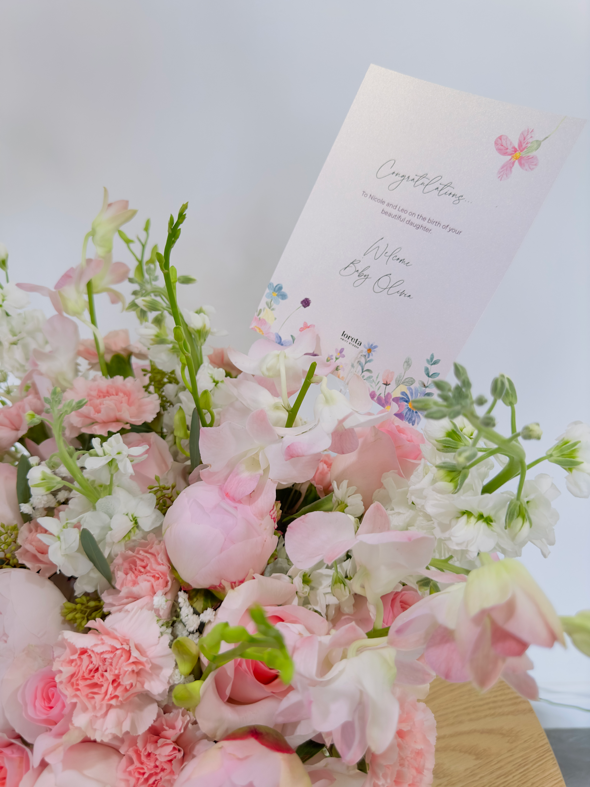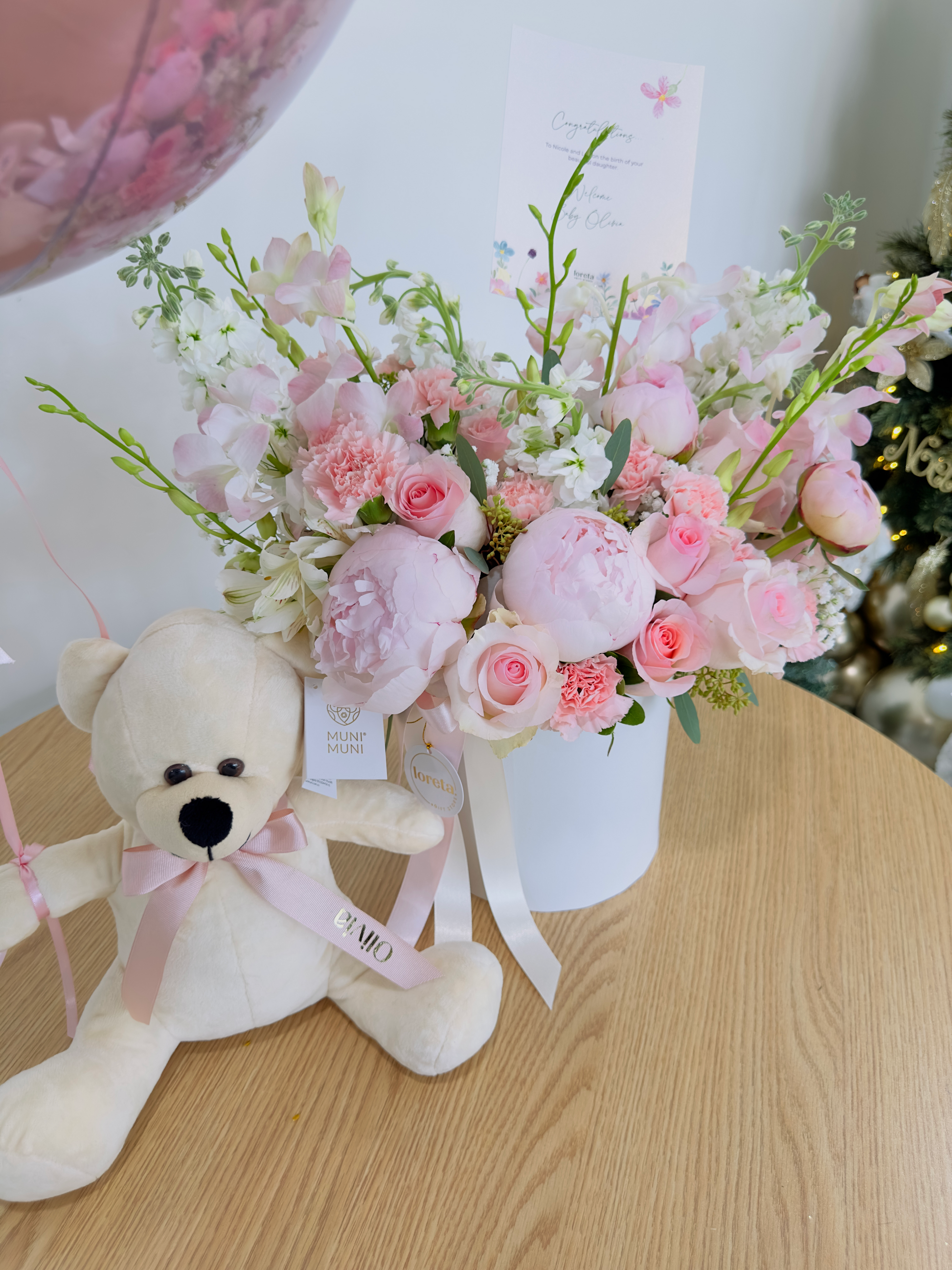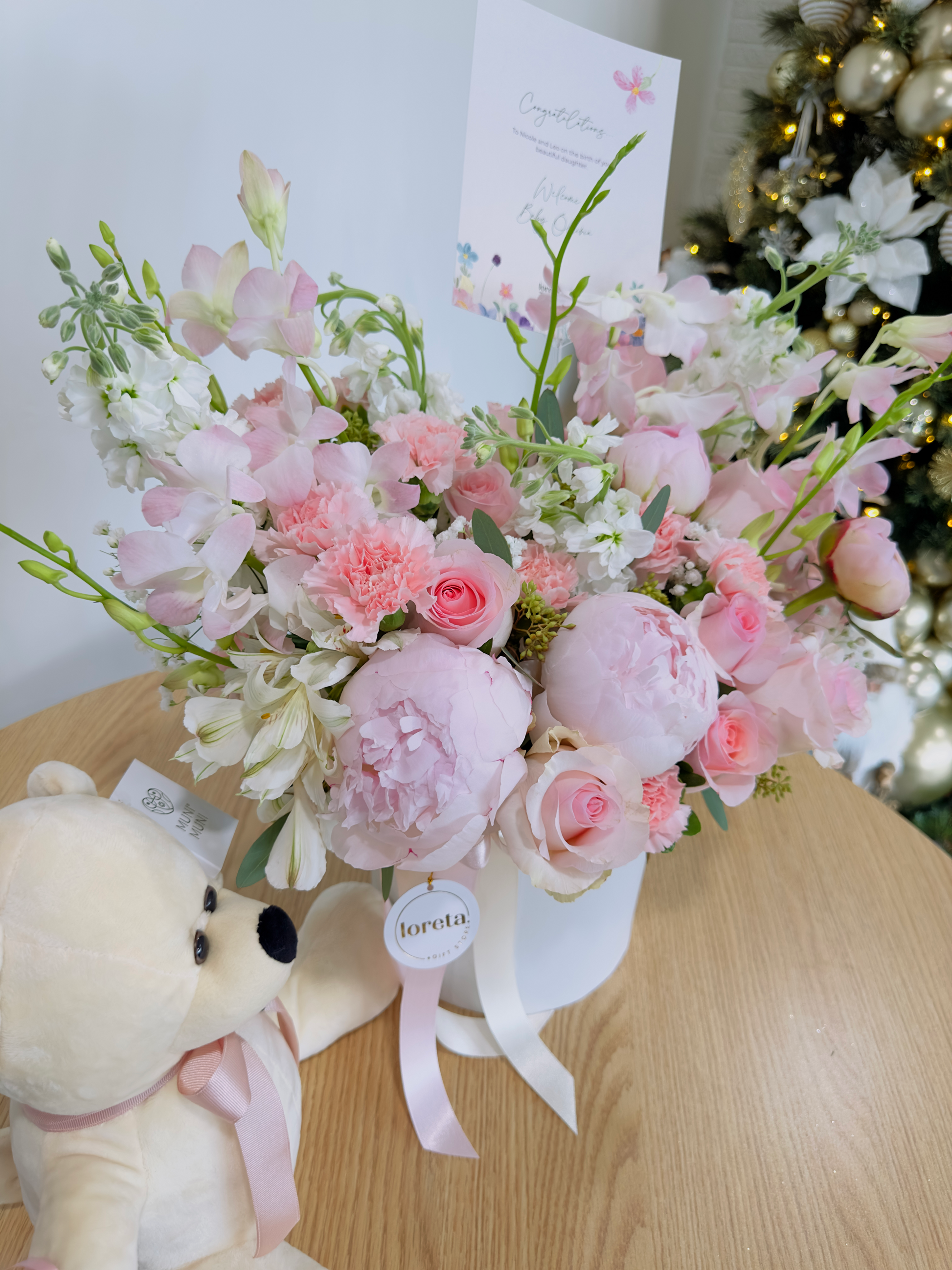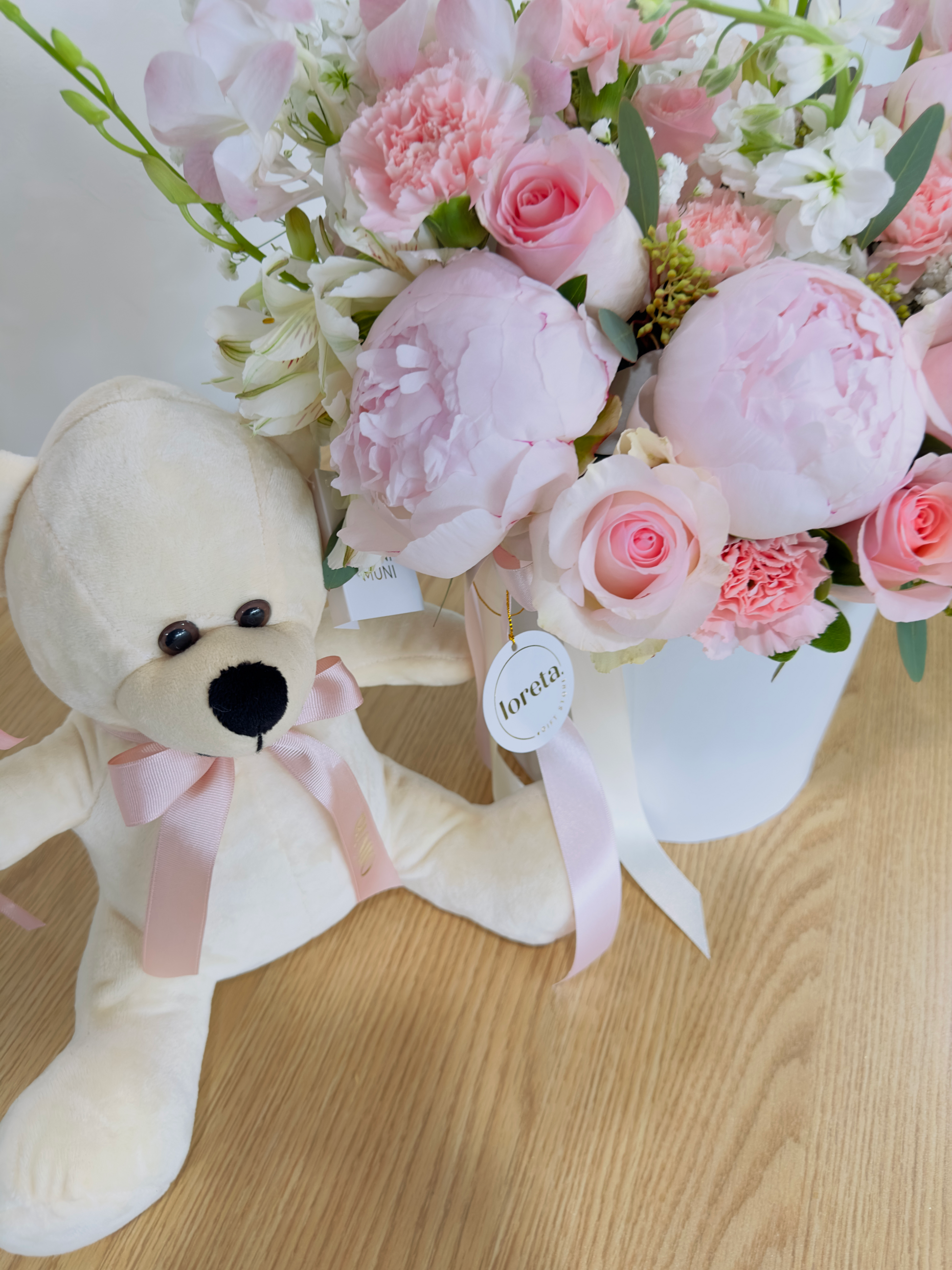 Immerse yourself in the delicate elegance of our Floral Charm Box. This captivating arrangement features an exquisite combination of orchids, peonies, roses, and a variety of flowers in pastel tones. Each flower has been carefully selected to convey love and style in every petal.