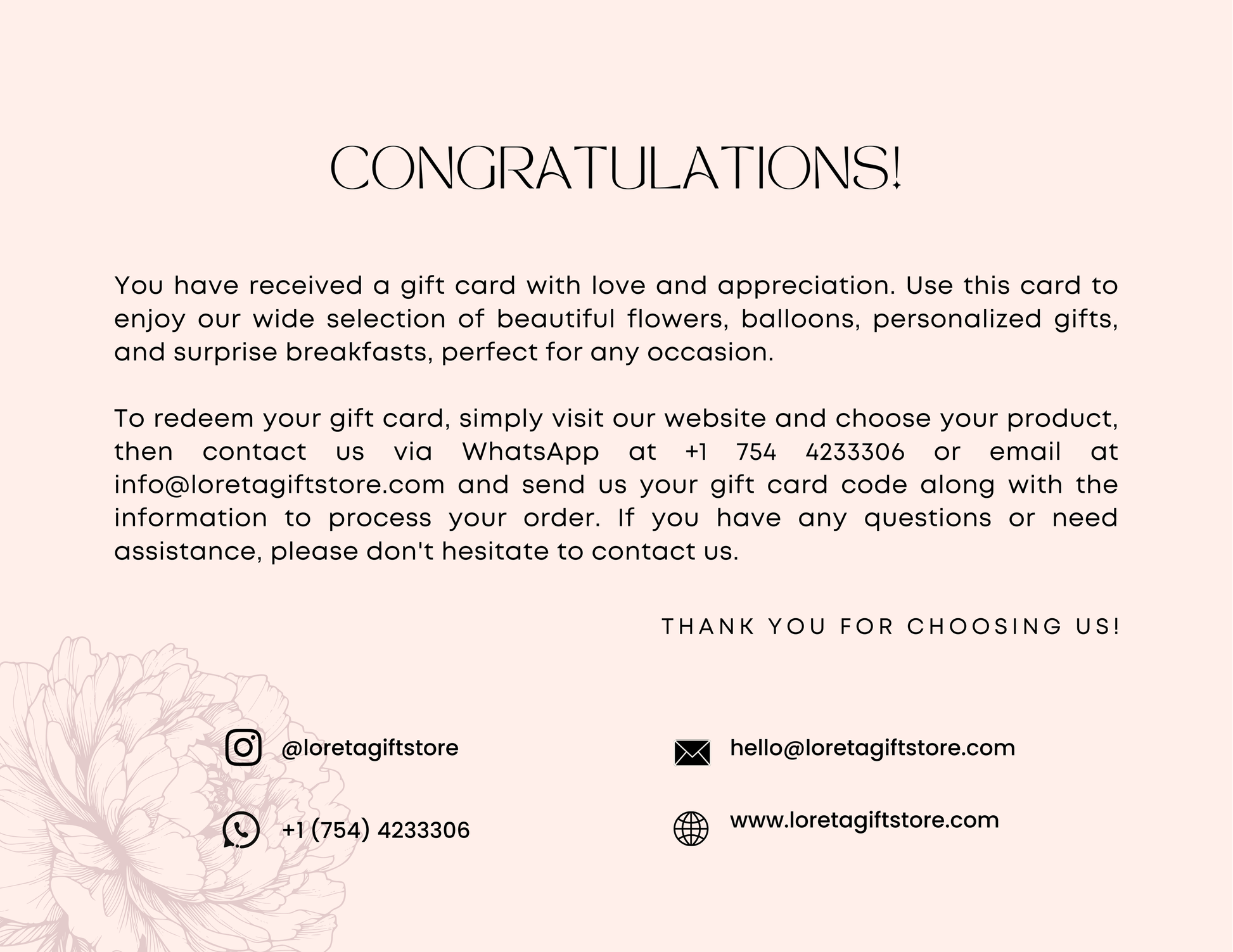 - Redeem your Gift Card: The person who receives the Gift Card can visit our website, choose their favorite products, and contact us via WhatsApp at +1 754 4233306 or email at info@loretagiftstore.com with the gift card code and the necessary information to process their order.