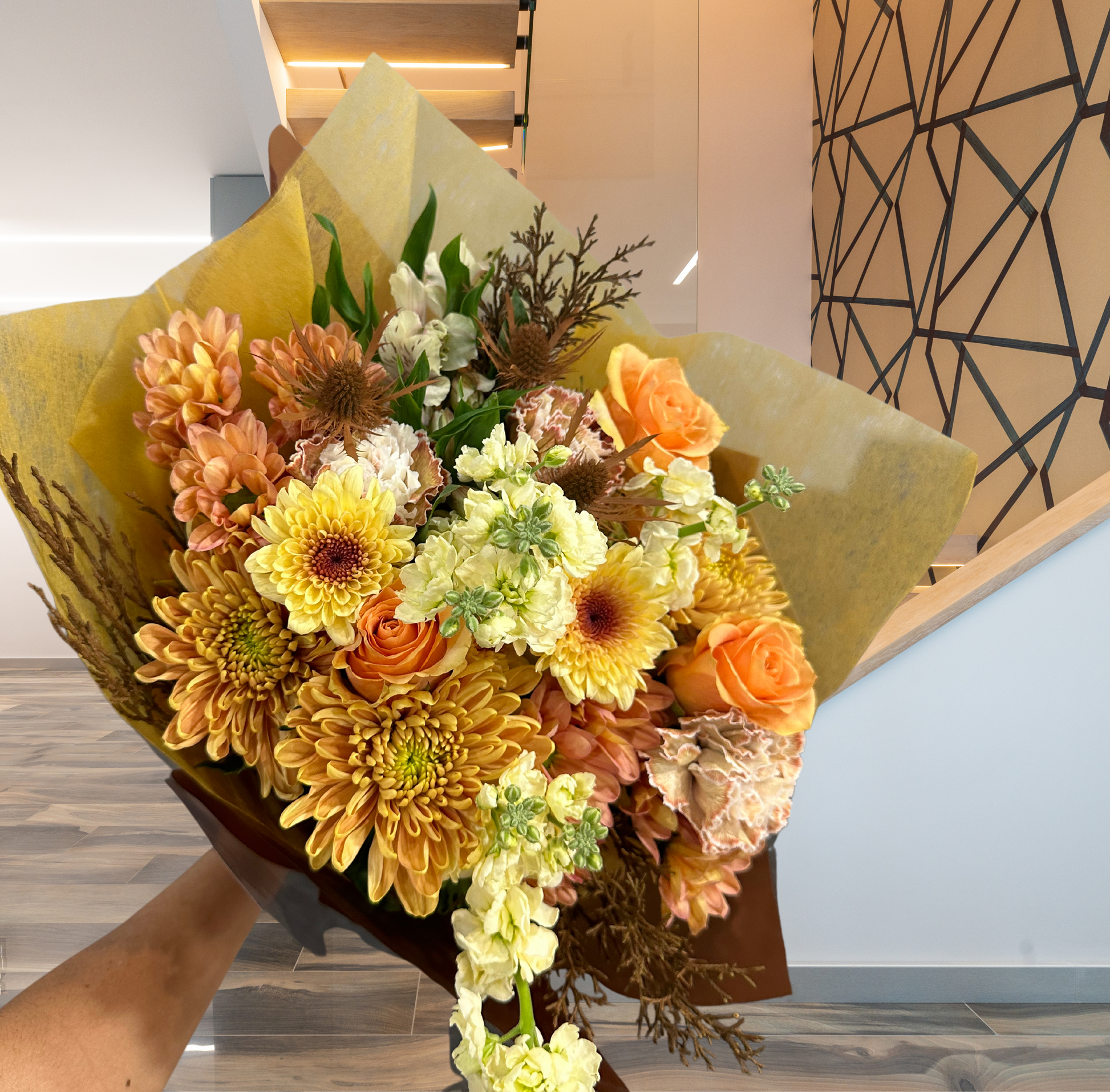 This small fall centerpiece captures the warm colors of the season with a blend of oranges, reds, golds, and greens. Perfect for intimate dinners or decorating small spaces, it adds a touch of warmth and elegance to any special occasion.