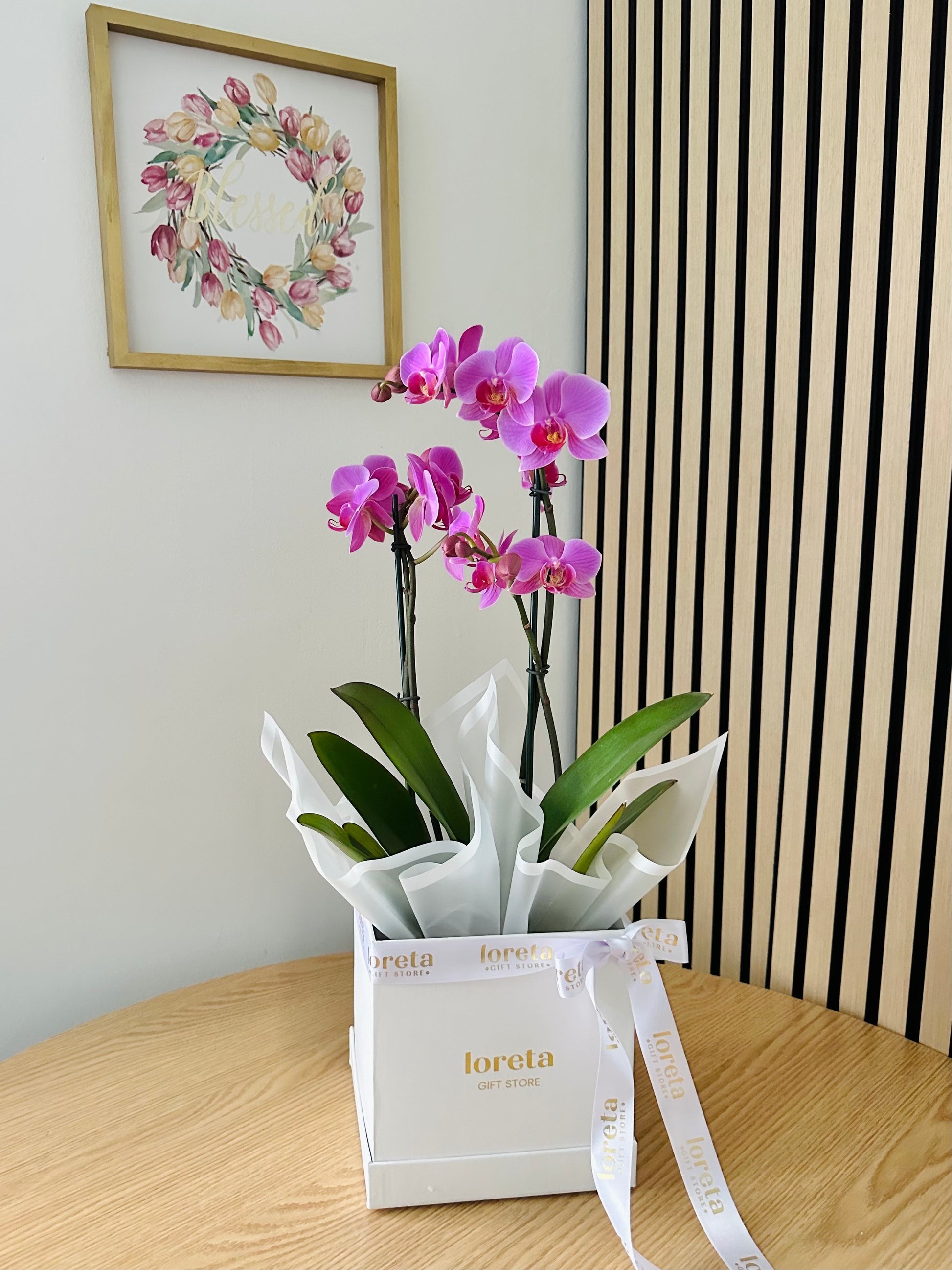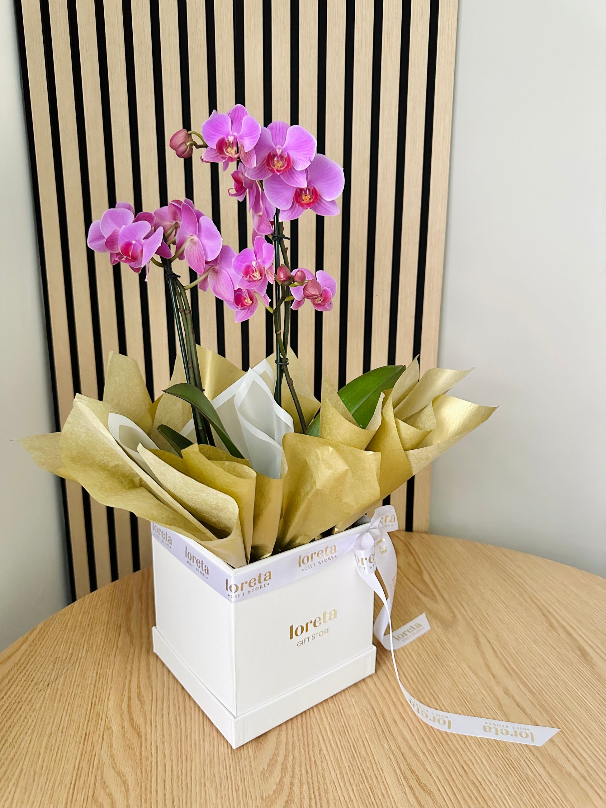 The Orchid Charm is a gift that embodies elegance and durability. This orchid is delicately packed in a luxury box and adorned with fresh greens, creating a sophisticated presentation that reflects its natural beauty. Known for their longevity, orchids symbolize love, strength, and purity, making them the perfect gift for any special occasion.