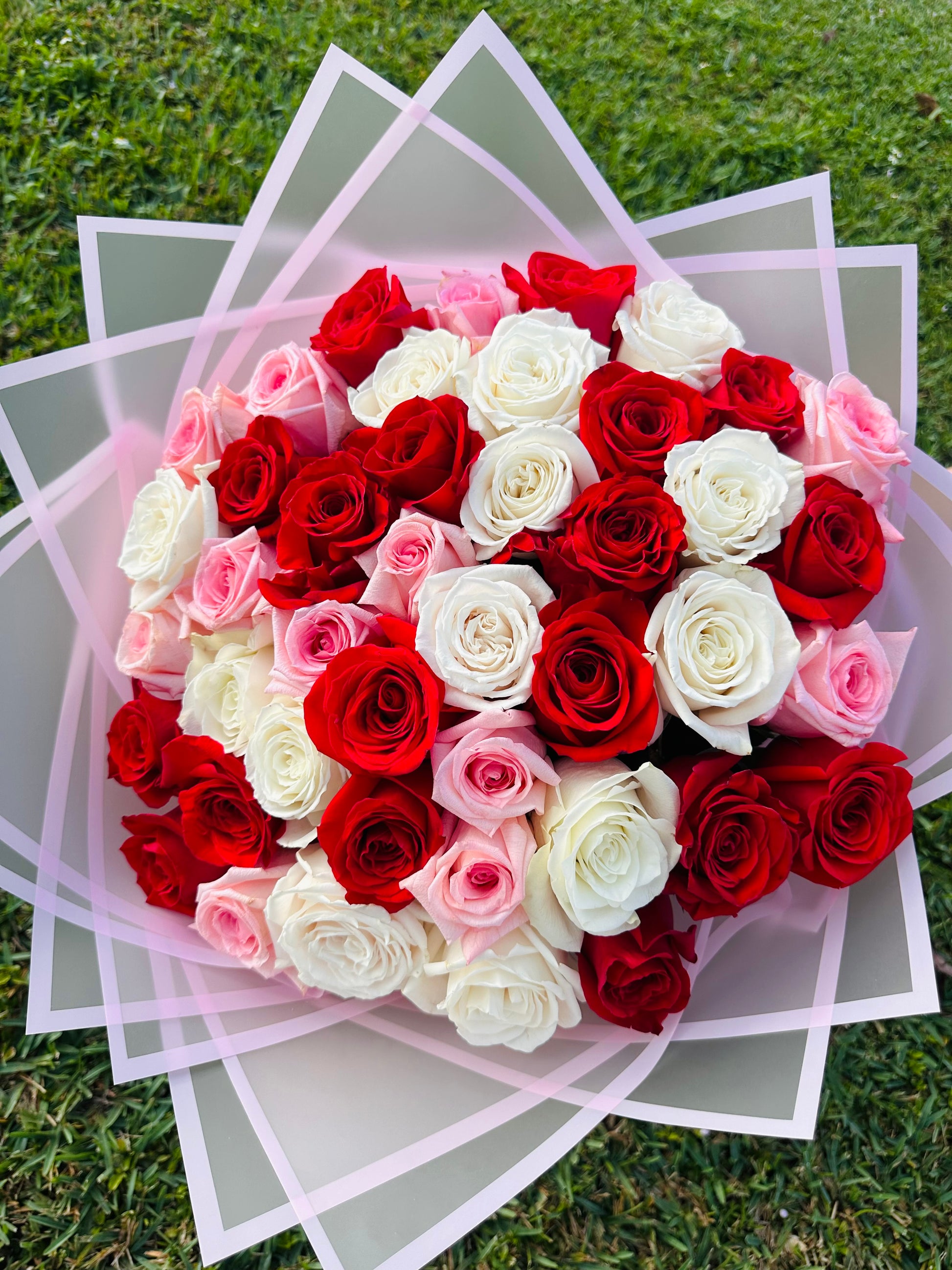 Express your love with the Trinity of Love Bouquet, featuring 50 premium roses in three captivating colors. This bouquet is perfect for Valentine’s Day or any romantic occasion, symbolizing unity, passion, and admiration.
